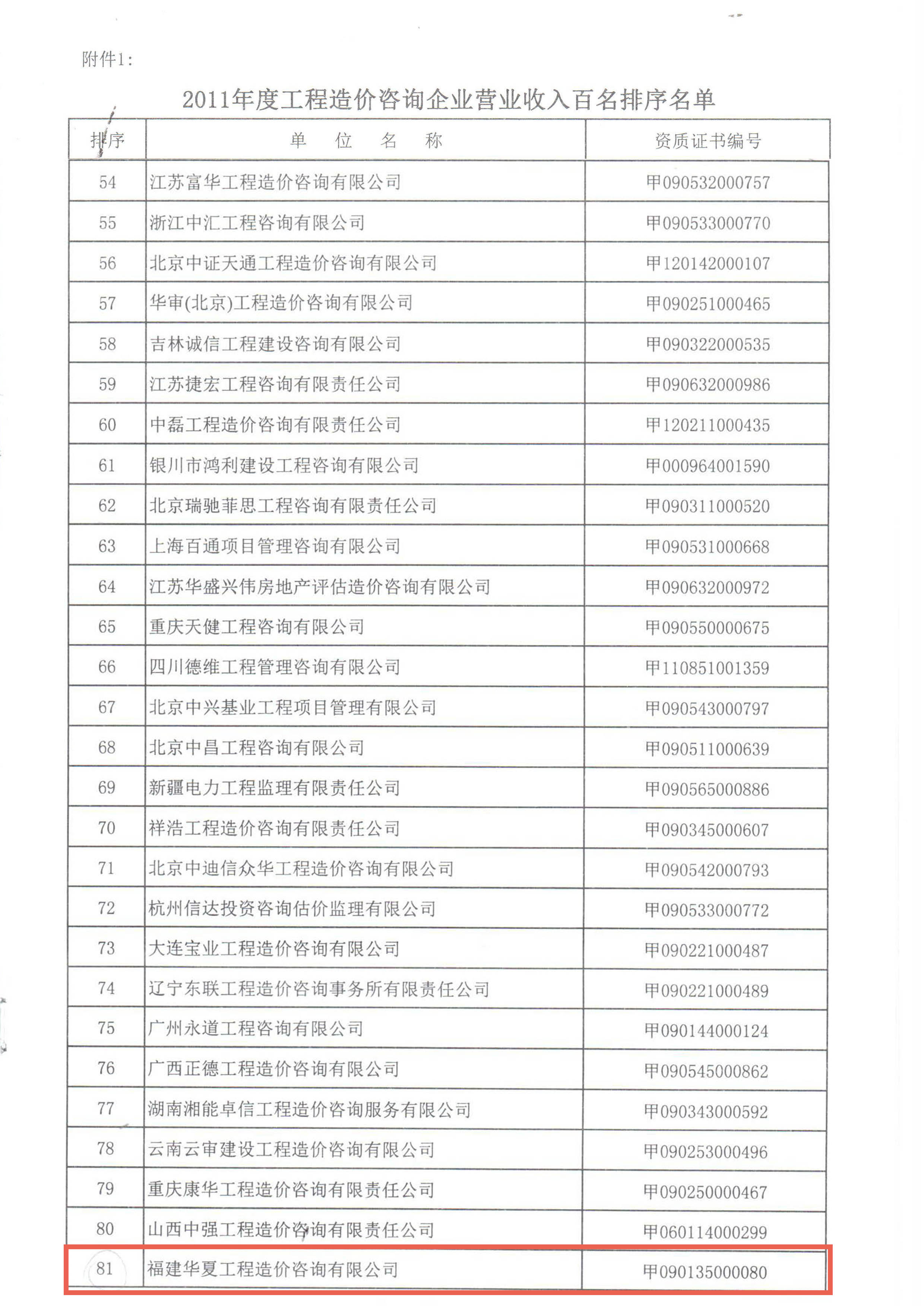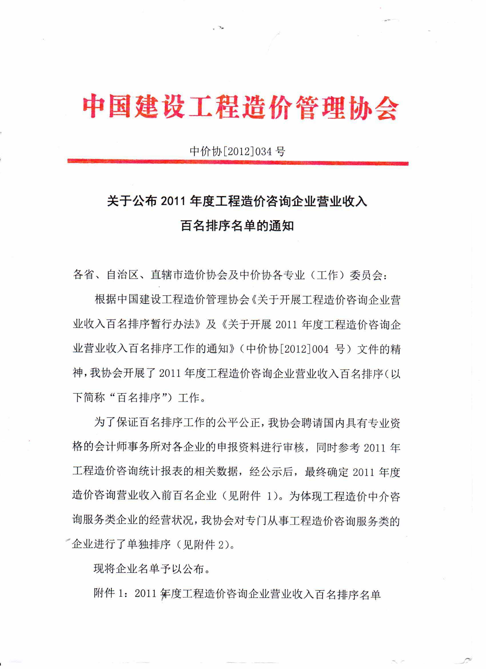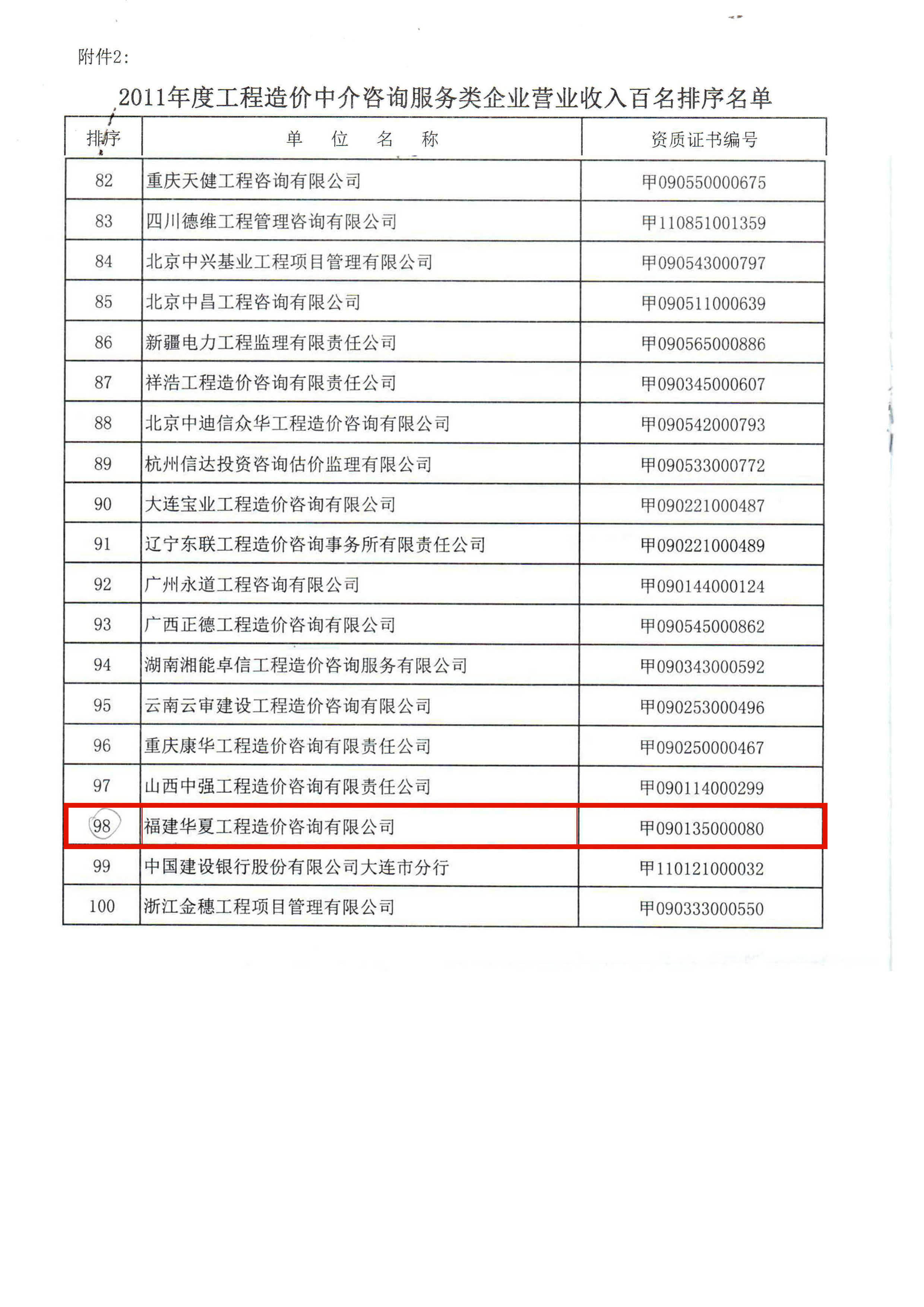 公司进入2011年度中国工程造价咨询企业百强