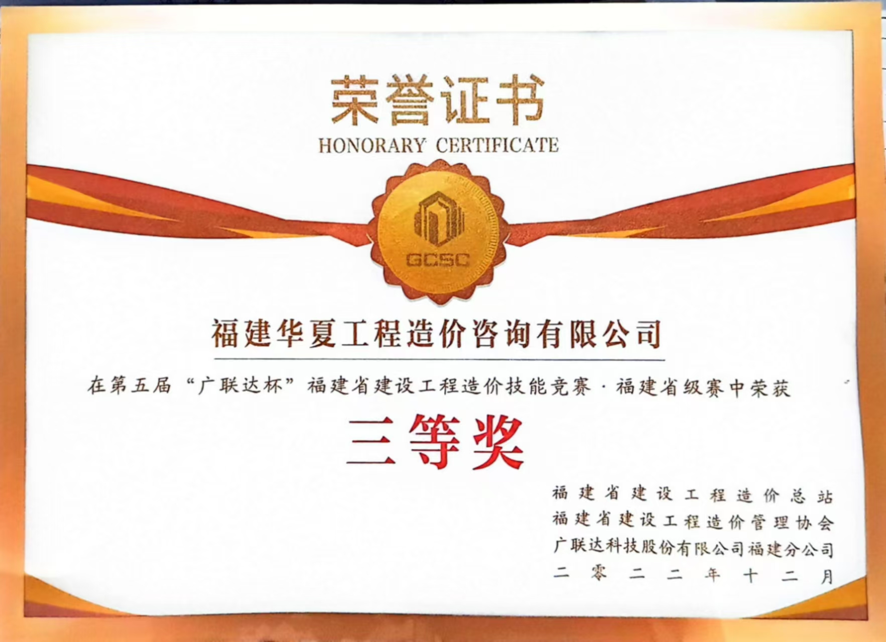 第五届“广联达杯”福建省工程造价技能竞赛省级赛三等奖