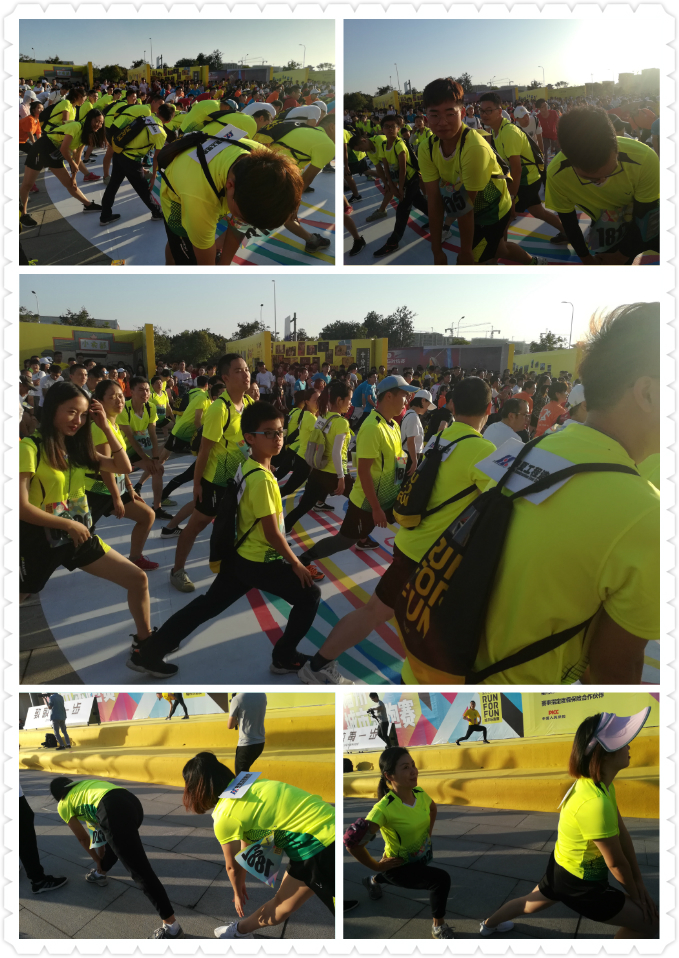 下午三点半左右,专业教练带领跑者们热身。瞧,咱们华夏乐跑团的队员们做起热身操来是不是也和工作中的态度一样认真?
